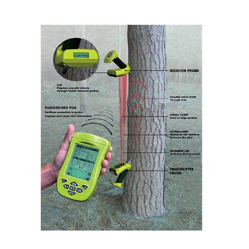 利用聲音在活體木材中的傳播速度,來判斷木質情況。輸出的聲音傳播速度是由聲音傳播的距離和時間計算而得。